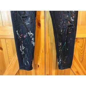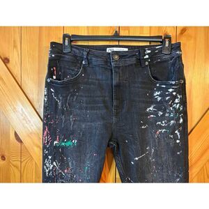 Zara Women Black high rise jeans. Paint Splatter Distressed with rip patch design. Stretch. Pin hole on back near left pocket. See pictures. Size 34 Measurements: Waist 32" Inseam 26" Rise 12" (8969)