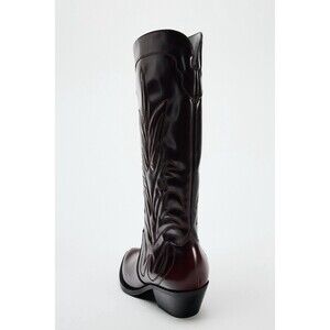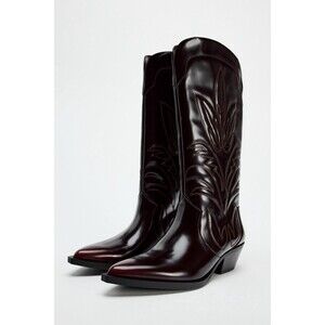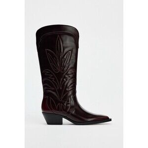 Zara Women Embroidered Cowboy Boots Knee High Western Burgundy US 8 EU 39