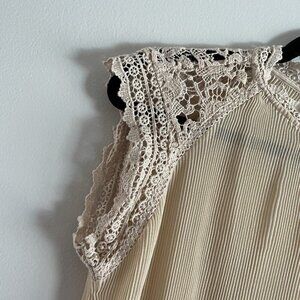 Zara Women S Beige Short Sleeve Lace Detail High Neck Pleated Peplum Blouse