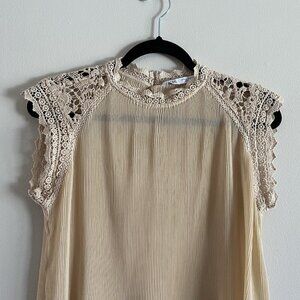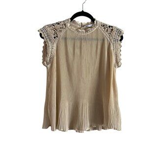 Zara Women S Beige Short Sleeve Lace Detail High Neck Pleated Peplum Blouse.