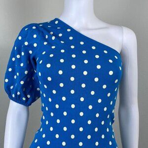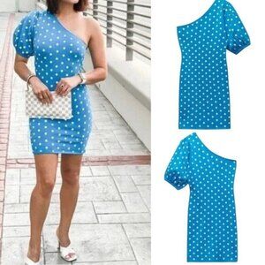 Zara Women Size S Blue Polka Dot One Shoulder Puff Sleeve Mini Bodycon Dress