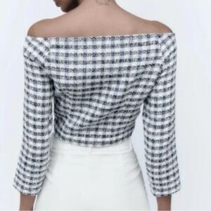 Zara Women XS Blue Plaid Textured Tweed Preppy Off The Shoulder Crop Top