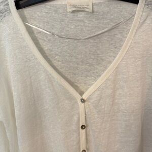 BRAND NEW without tags. Women’s Zara 100% linen button up cardigan in ivory. V-Neck, light weight, longer in the back, long sleeves. Size small. MSRP $69