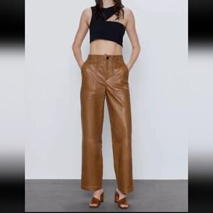 Zara Women's 100% Sheep Leather Camel Cargo Pants Straight Leg Size S