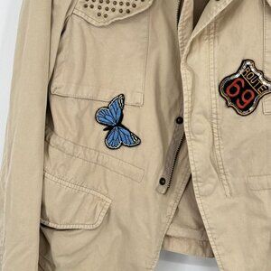 Zara Womens Beige Jacket size Medium Studded Pockets Patches Butterflie Route 69