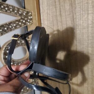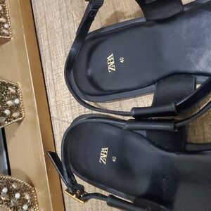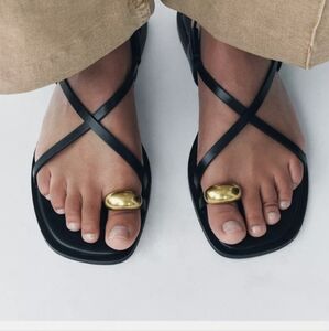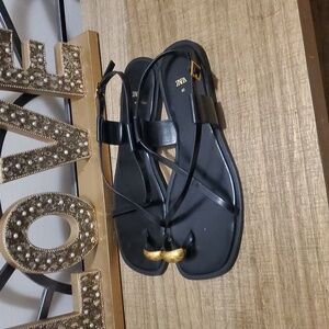 Chic Zara sandals with a sleek black design. Features stylish gold details. Perfect for any occasion.
