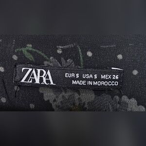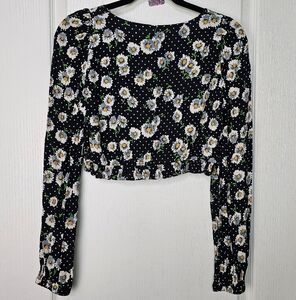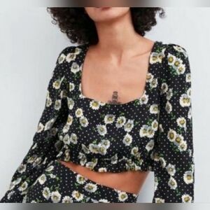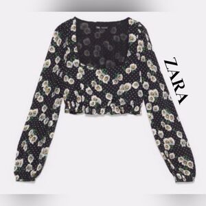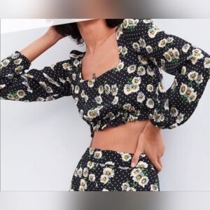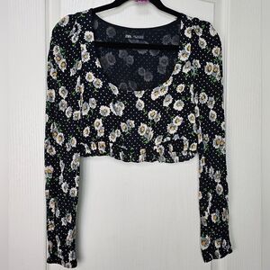 Zara Women's Black Floral Daisy Print Long Sleeve Square Neck Crop Top, SMALL