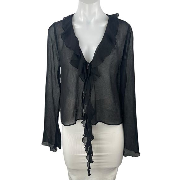 Zara Women's Black Plunge V-neck Ruffle Collar Long Sleeve Sheer Blouse Top Sz M