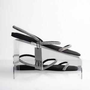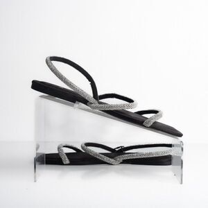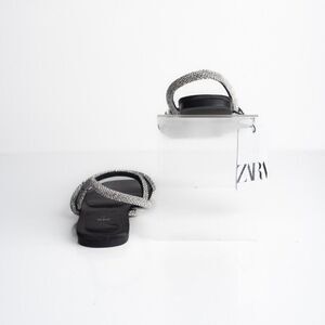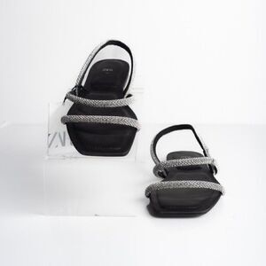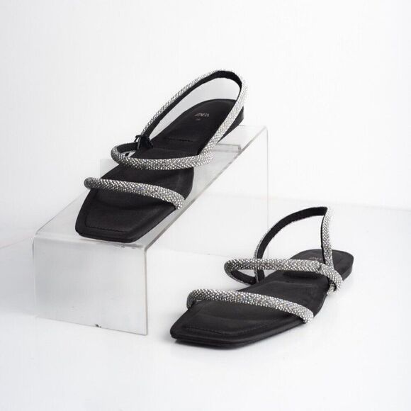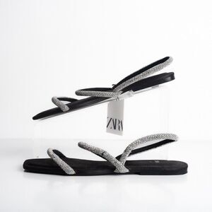Zara Womens Black Strappy Rhinestone Slingback Flat Sandals