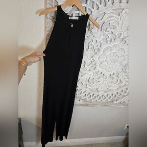 Chic black jumpsuit with a sleeveless design. Features a sleek silhouette and button detail.