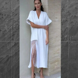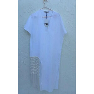 Elevate your style effortlessly with the Zara Women's Bloggers Fave Linen Fringed Midi Dress in White, Size Medium. Crafted from high-quality linen, it offers breathable comfort and luxurious feel. With chic fringed detailing, this dress exudes contemporary flair, perfect for any occasion.