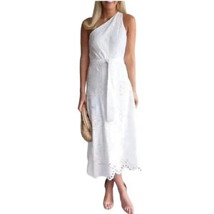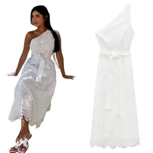 Introducing Zara's White Embroidered Asymmetrical Dress, Size Small – a fusion of sophistication and individuality. Delicate embroidery enhances its asymmetrical design, exuding charm. Versatile and elegant, it's perfect for any occasion.