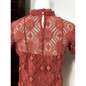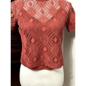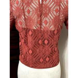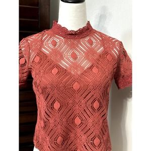 Zara Womens Blouse Red Geometric Short Sleeve Mock Neck Keyhole Crochet M