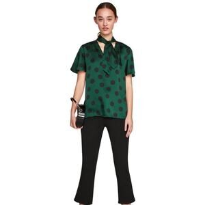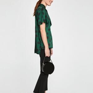 Zara Womens Blouse Size Medium Silky Polka Dot Bow Necktie Green Black NEW