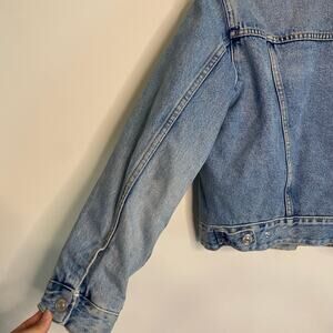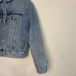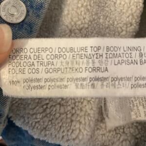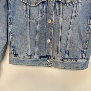 Stay warm and stylish with this Zara women's blue denim jacket! This jacket features a cozy sherpa lining, perfect for those chilly days. The cropped length and trucker style give it a trendy, western-inspired look.