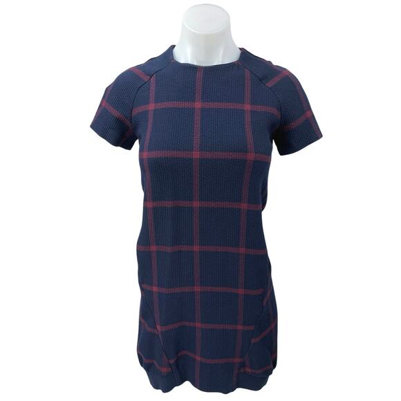 Zara TRF Women's Blue Plaid Checkered Knit Short Sleeve Mini Shift T-Shirt Dress Size XS