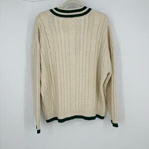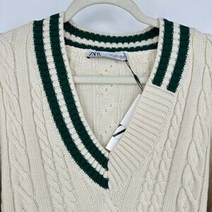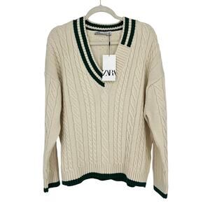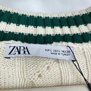 Zara Women’s Cable Knit Sweater Size L Ecru Green Striped Preppy Tennis