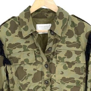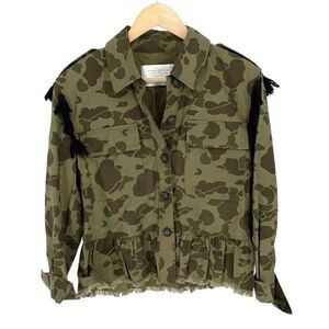 Zara Womens Camo Embroidered Pompom Tassel Frayed Hem Outerwear Winter Peplum Jacket Green XS