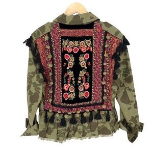 Zara Womens Camo Embroidered Pompom Tassel Frayed Hem Peplum Jacket Green XS