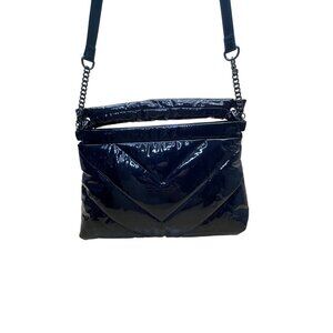 Quilted black shoulder bag with a shiny patent finish, chain strap detailing, and spacious interior for essentials. Stylish and functional.