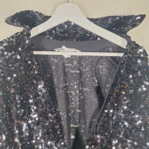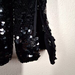 This is a black sequin tunic dress from Zara in size XS. It features long sleeves and falls at a midi length. The style is described as blouson, adding a relaxed and flowy silhouette to the dress. Perfect for a glamorous yet comfortable look.