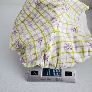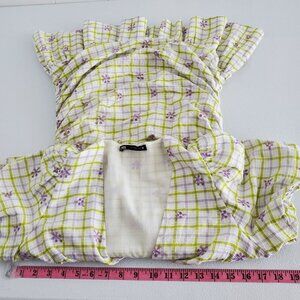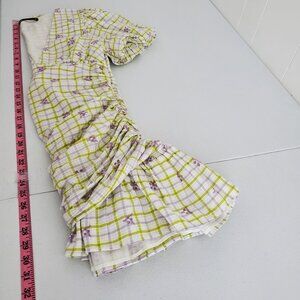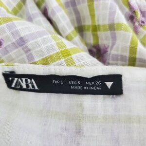This Zara mini dress features a charming plaid pattern with delicate floral details. The V-neck and ruched design add a flattering touch, while the short puff sleeves provide a trendy look. Perfect for casual settings.