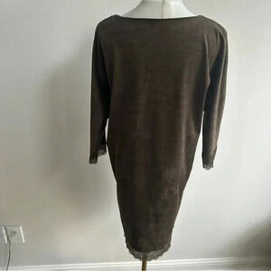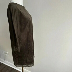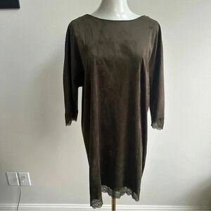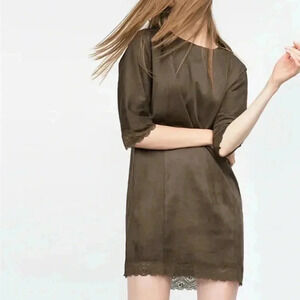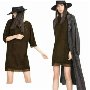 Zara Women’s Faux Suede Midi Lace Trim Olive Green Casual Boho Shift Dress Med