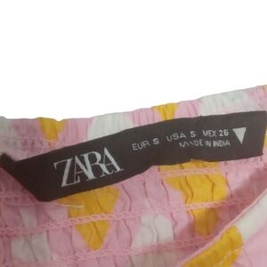 Trendy Zara puff sleeve bodysuit featuring a pink base with yellow floral print. Designed with dramatic short balloon sleeves, a square neckline, and fitted bodice for a flattering silhouette. Lightweight stretch fabric offers both comfort and style. Perfect statement piece for date night, parties, or styled with jeans, skirts, or tailored pants for a chic look.
