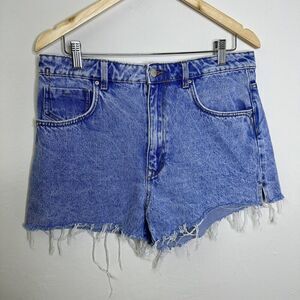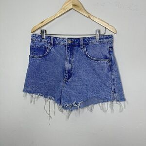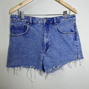 Zara Women's High Rise Cut Off Denim Shorts Size 12 Blue Frayed Hem Pockets.