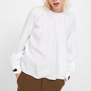 Zara Women’s l/s mock neck blouse. Has eclectic etiquette tort buttons on the back side and at wrist. Shirring detail around neckline. high-low hem (lower on back).