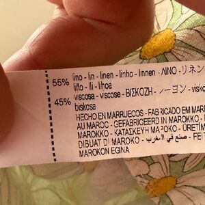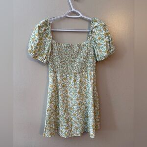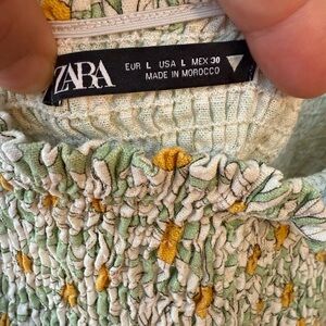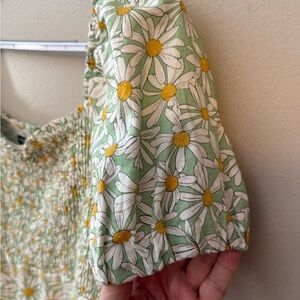 Zara Womens Linen Blend Babydoll Smocked Mini Daisy Floral Dress Large Green White Yellow