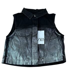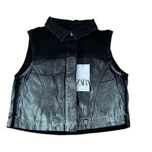Zara Women’s Metallic Silver Foil Denim Black Button Front Vest Size S NWT. New with hidden button front, side slit. Approx. meas.: pit to pit 17", length 17"