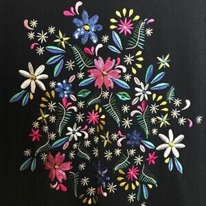 Embroidered and sequin floral detailing on the center of dress in a circle.