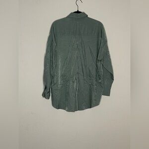 Olive green blouse with button-up front. Lightweight and stylish. Ideal for layering. Has sheen to it.