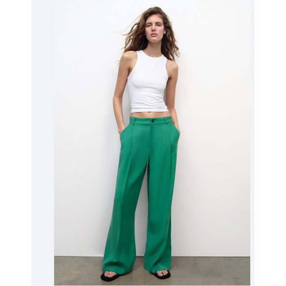 Zara Womens Pants Size XL Trousers Green Flowy Pleated Wide Leg 5427/420 NWOT