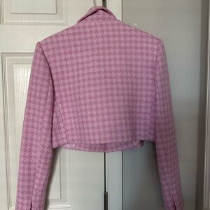 Stylish pink houndstooth blazer by Zara. Cropped design with double-breasted front. Ideal for a fashionable look.