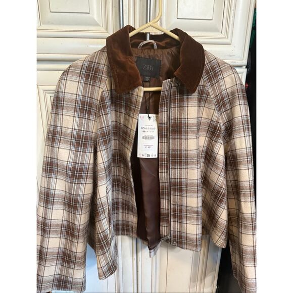Zara Women's Plaid Full Zip Velvet Collar Cropped Cape Jacket Brown XS NWT