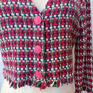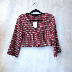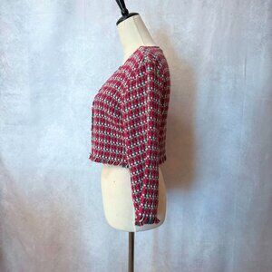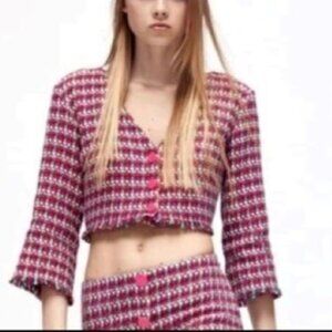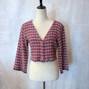 Zara Women's Plaid Textured Cropped Jacket Short Fringe Pink Multi Size M