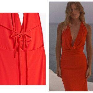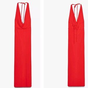 Zara Womens Red Draped Cowl Halter neck Maxi Dress open back Sz L NWT classy