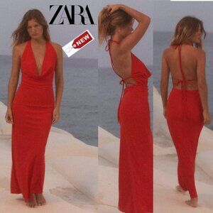 Zara Red Cowl Halter Neck Maxi Dress New, Zara Women's Backless Red Halter Maxi Dress, Zara Draped Halter Neck Red Maxi Dress, halter neck dress, maxi dress with open back, red formal dress, Zara evening gown, draped maxi dress, cocktail maxi dress