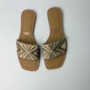 Stunning slide on sandals with gold embroidery and gold tone rhinestones. Size 38. Some very minor wear to soles. Excellent condition.