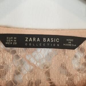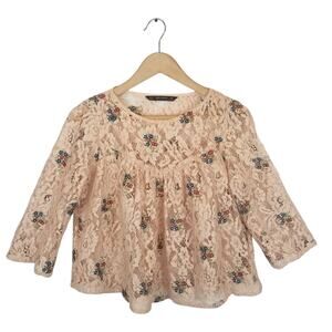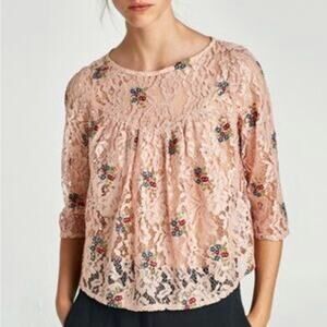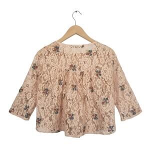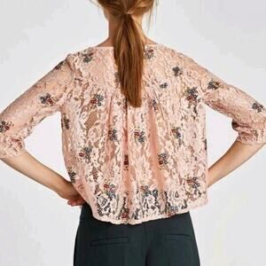 Zara Women's Rose Gold Dusty Pink Floral Lace Embroidered Cropped Blouse Medium