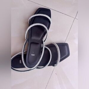 Chic Zara sandals with a sleek black design. Features sparkling silver straps. Perfect for stylish outings.