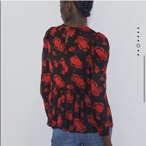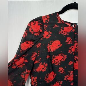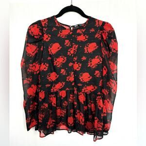 Zara Women’s Sheer Chiffon Black Red Floral Blouse Size Medium