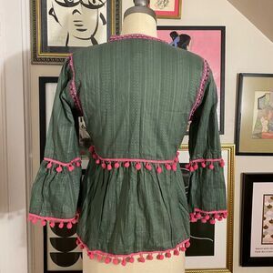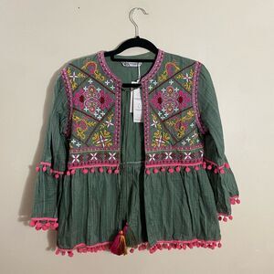 Zara Womens Size Medium Embroidered Kimono Cape Cardigan Green Pink Tie Neck NWT