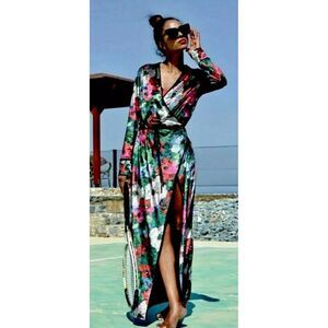 Zara Women's Size S Floral Velvet Wrap Duster Maxi Dress Robe Cardigan Blogger