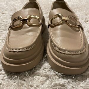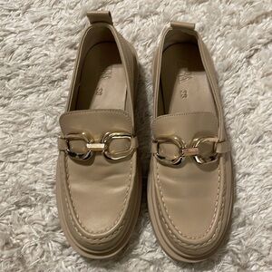 Zara Women’s Slip On Loafers Size 7 Tan Khaki Gold Buckle Chunky Lug Sole