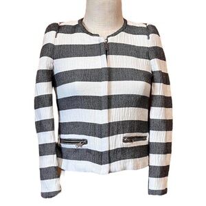 Elevate your wardrobe with this Zara women's size small blazer crafted from 100% cotton in a sophisticated dark gray and white vertical stripe pattern.