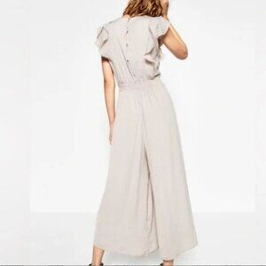 Zara Women's Small Ruffle Jumpsuit Gray Silver Lined Sleeve Button Back Wide Leg