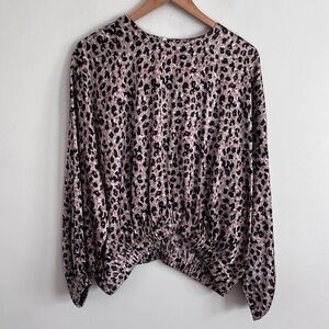 animal print top, leopard blouse, ruched hem, blouson sleeve, pink and black print, bold pattern, relaxed fit top, trendy statement top, casual chic, night out style, soft lightweight fabric, fall transition top